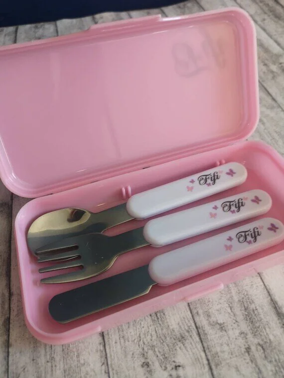 Personalised cutlery sets: Knife, fork and spoon in a personalised display box.